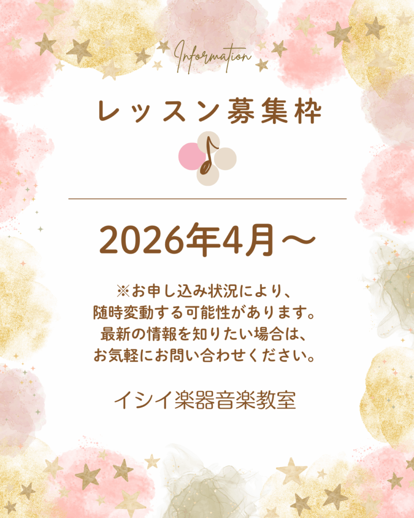 2026年 3月11日(水) 2026年4月以降のレッスン募集枠(ピアノ・エレクトーン)をご案内いたします。お申し込み状況により、随時変動する可能性があります。最新の情報を知りたい場合は、お気軽にお問い合わせください。 […]